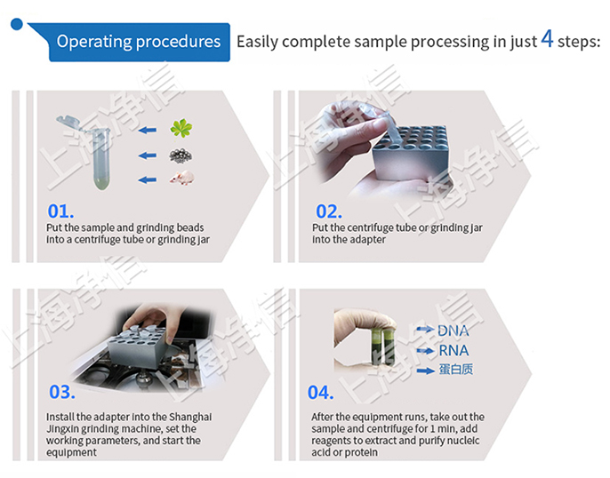 The movement of the adapter can be superimposed with the movement of the inner ball to fully mix the sample. The mixing effect can be further improved by using multiple small-diameter grinding balls. The use of multiple small-diameter grinding balls during grinding can greatly improve the homogeneity of the sample. Biological cells can be disrupted by using a large number of small balls (such as glass beads). The huge impact and friction between the ball and the ball can effectively achieve the fragmentation of the cells.