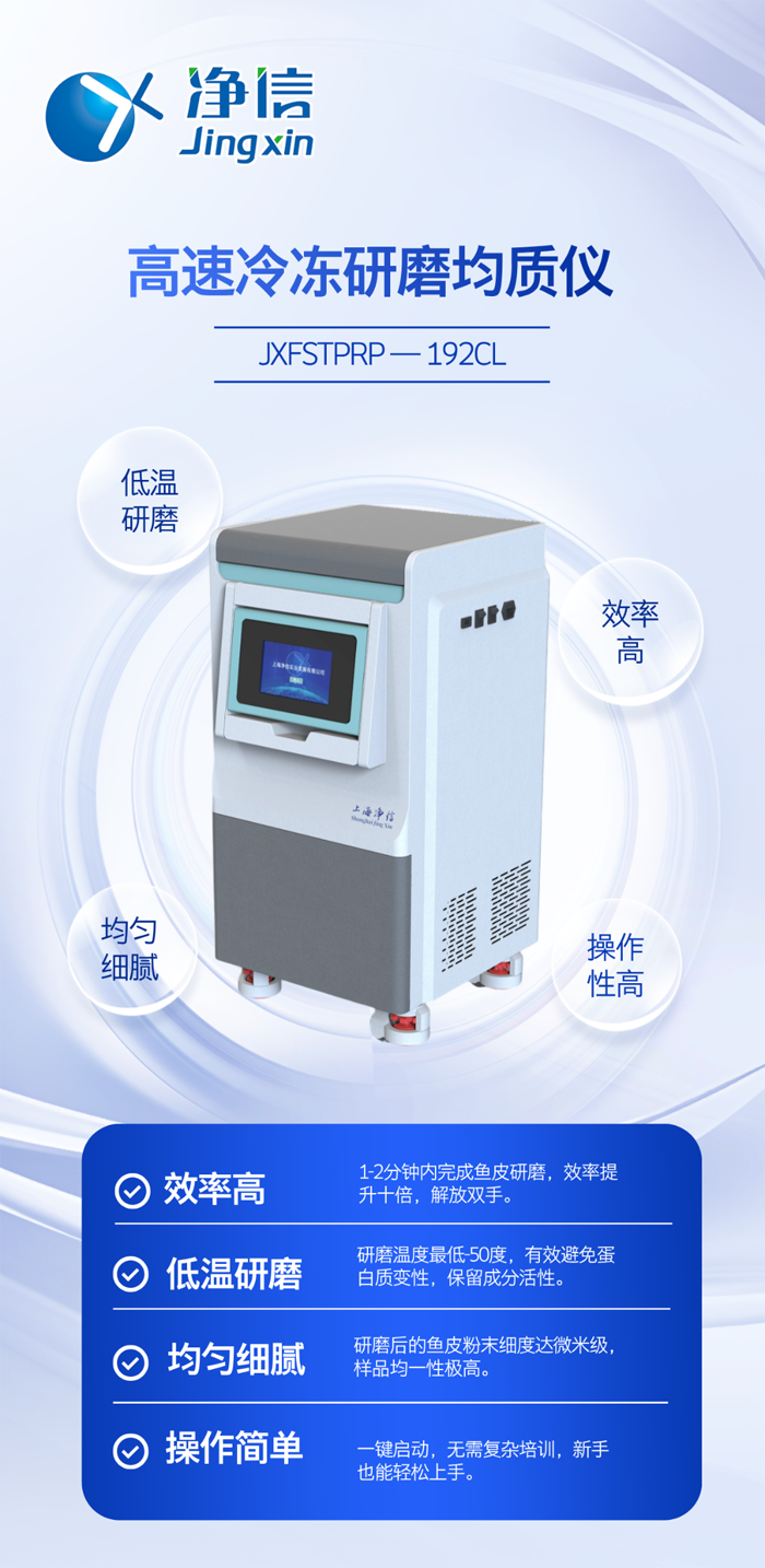 實驗背景:魚皮中富含膠原蛋白等活性成分,是美容保健、功能食品研發的熱門原料。但在實驗分析前,常需將魚皮研磨成均勻細粉,選對儀器,實驗事半功倍。凈信高速冷凍研磨均質儀助您輕松解決研磨問題!
