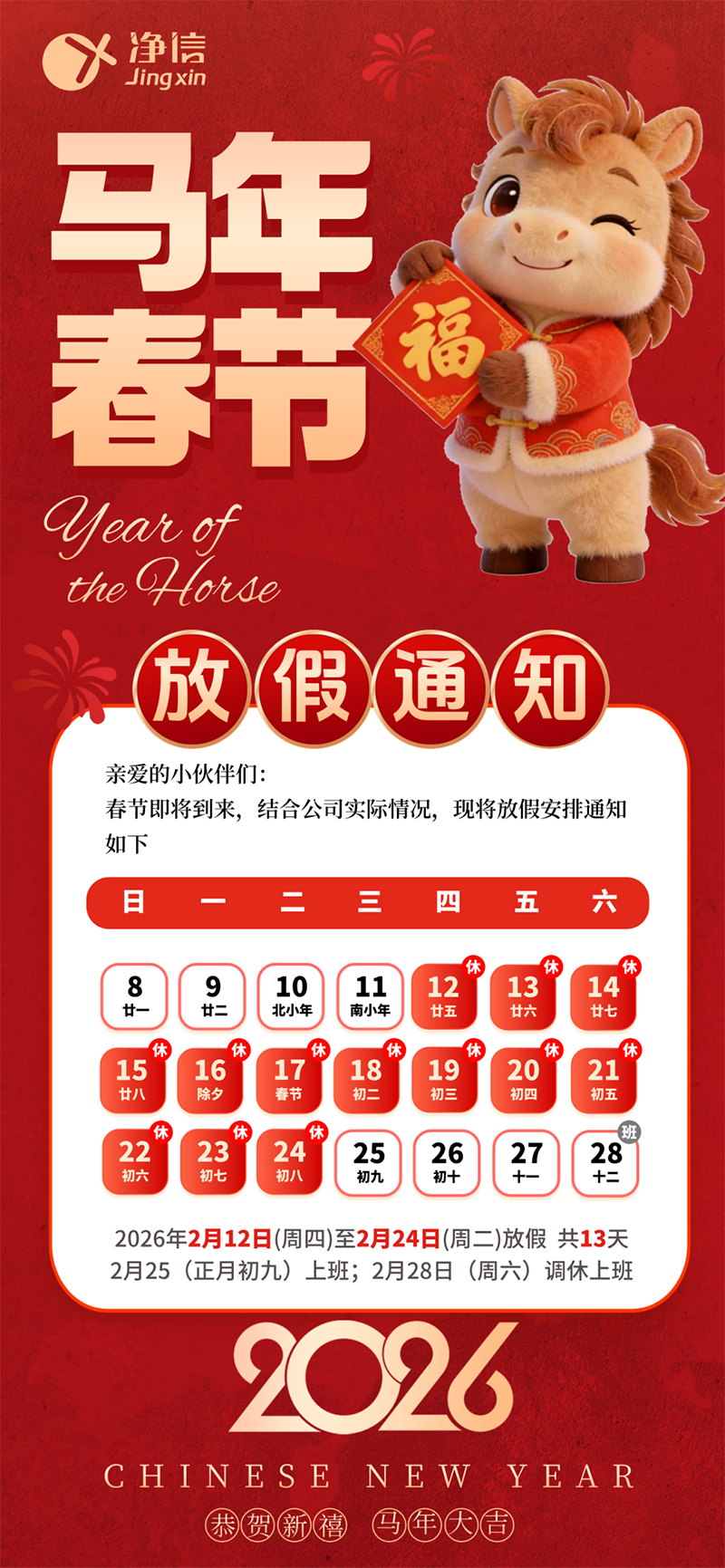 丙午新歲 馬力全開 | 上海凈信2026春節放假通知