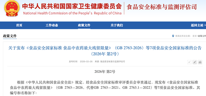 圖片來源說明: 本文政策文件截圖來源于中華人民共和國國家衛生健康委員會官方網站公開信息(食品安全標準與監測評估司,2026年第2號公告),僅供政策解讀與行業交流使用。