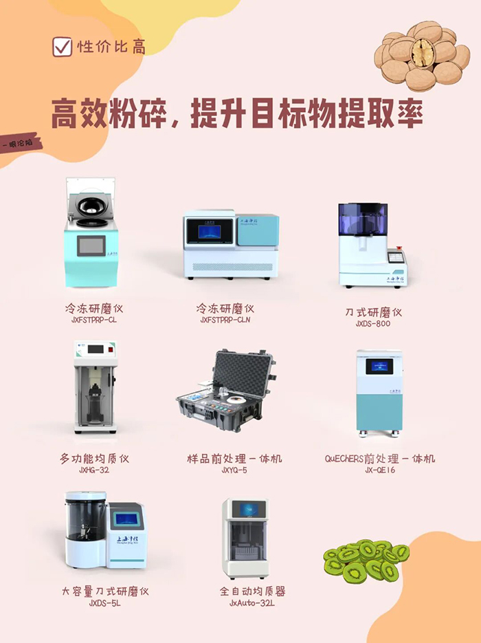 樣品研磨是農殘提取的基礎,凈信多款研磨儀針對不同農產品基質、檢測需求設計,實現樣品快速、充分粉碎,大幅提升農藥提取率,為后續檢測筑牢基礎: